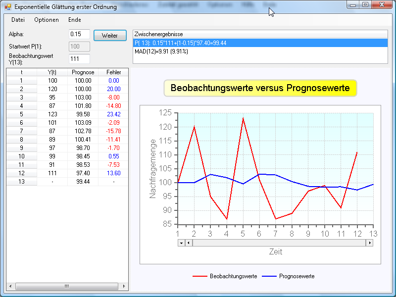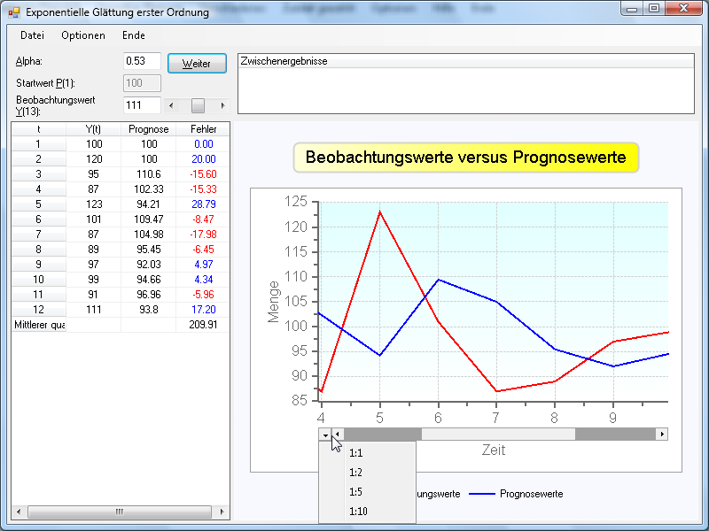 Nach Eingabe aller Werte kann der Einfluß des Glättungsparameters auf die Prognosequalität im Rahmen einer Sensitivitätsanalyse untersucht werden, die über die Optionen aktiviert wird. Es erscheint dann ein Schieberegler zur Veränderung von Alpha. Nach Veränderung von Alpha erhält man dann z.B. folgendes Bild: