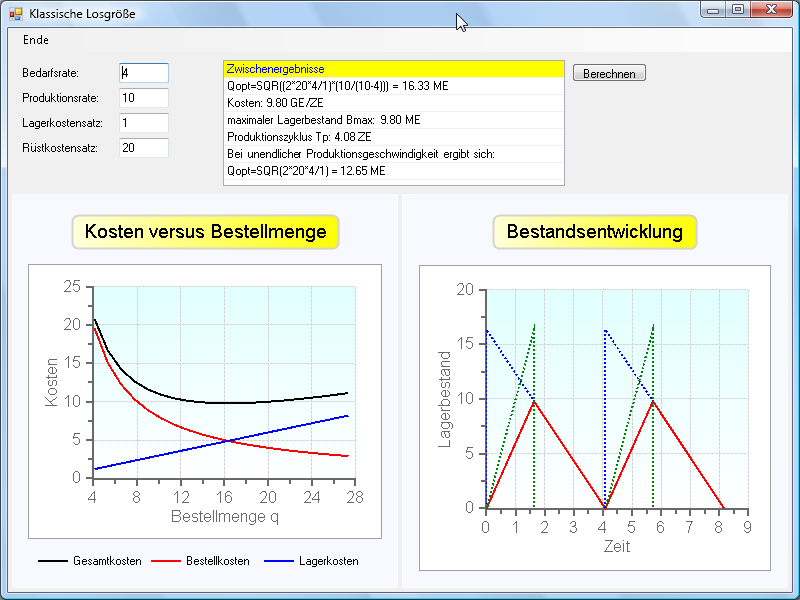 Es wird die optimale Losgröße bei kontinuierlicher und konstanter Nachfragerate und kontinuierlicher und konstanter Produktionsrate für ein einzelnes Produkt berechnet.