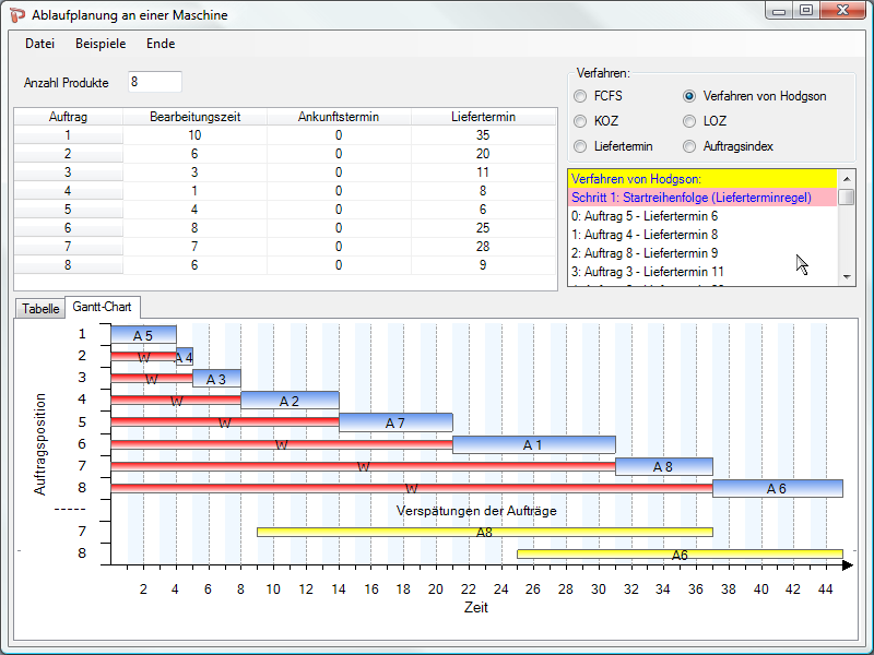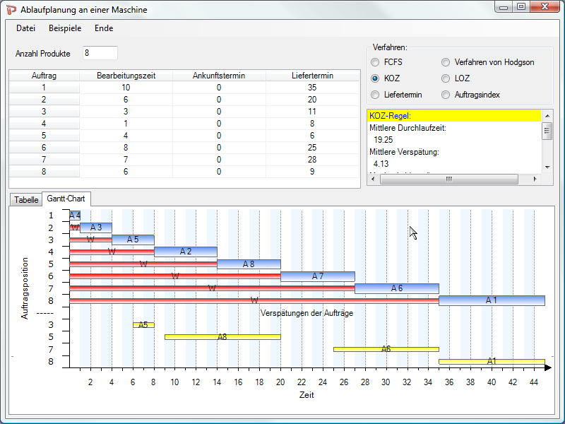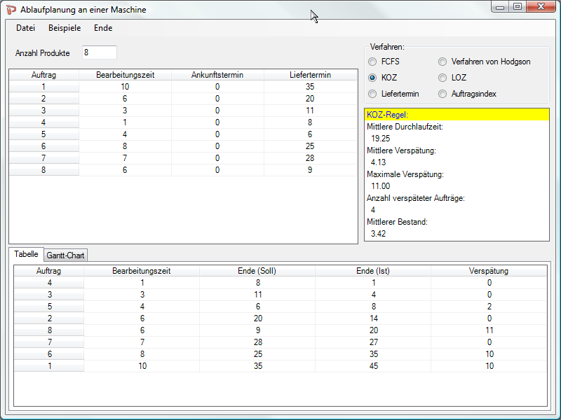 Es werden verschiedene Prioritätsregelverfahren zur Maschinenbelegungsplanung an einer Maschine hinsichtlich ihrer Auswirkungen auf verschiedene Zielgrößen verglichen: die FCFS-Regel, die KOZ-Regel und die Liefertermin-Regel. Darüberhinaus ist der Algorithmus von Hodgson (Moore) zur Minimierung der Anzahl verspäteter Aufträge implementiert.