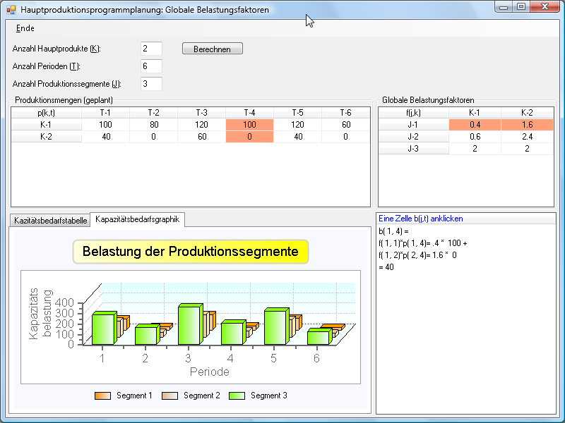 Der hier implementierte Algorithmus dient der Beantwortung der Frage, ob ein bereits festgelegtes Produktionsprogramm (Hauptproduktionsprogramm, p(k,t)-Matrix) im Hinblick auf die vorhandenen Ressourcen realisierbar ist. Dafür werden in den Kapazitätsbelastungsfaktoren die gesamten Belastungen des Arbeitssystems j kumuliert, die sich aus der Produktion einer Einheit des Erzeugnisses k einschließlich aller seiner Vorprodukte ergeben (f(j,k)-Matrix). Die periodenbezogene Belastung der Arbeitssysteme, dargestellt durch die b(j,t)-Matrix, ergeben sich dann aus der Matrizenmultiplikation der f(j,k)-Matrix mit der p(k,t)-Matrix. Die Zulässigkeit des Produktionsprogramms im Hinblick auf die vorhandenen Kapazitäten kann durch Vergleich mit den Periodenkapazitäten der einzelnen Arbeitssysteme festgestellt werden.