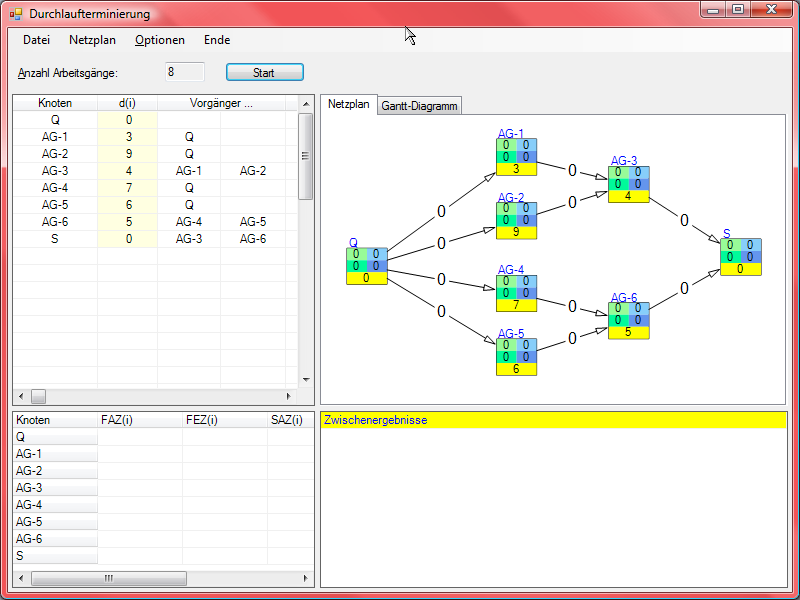 - bekannter Vorranggraph für die Arbeitsgänge (Netzplan)