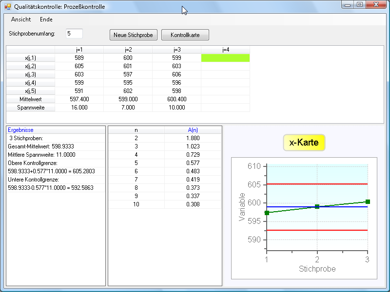 Die Prozeßkontrolle ist eine statistische Qualitätskontrolle, bei der die Einhaltung der Produktionsqualität durch die regelmäßige Entnahme von Stichproben aus der laufenden Produktion überwacht wird. Dabei werden gewisse zufällige Schwankungen der Produktionsqualität toleriert, während systematische Abweichungen oder systematische Schwankungen als Folgen fehlerhafter Einstellungen des Produktionsprozesses verstanden werden. Hier soll nun die Prozeßkontrolle einer einzelnen Variablen betrachtet werden (z.B Durchmesser eines zylindrischen Werkstücks). Dafür wird der Verlauf der Stichbrobenmittelwerte (x-Kartentyp) bzw. der Spannweitenmittelwerte (R-Kartentyp) (blaue Kurve) im Vergleich zum Gesamtmittelwert der Stichproben bzw. Spannweiten (grüne Linie) beobachtet. Als gerade noch akzeptable Abweichungen werden die obere Kontrollgrenze (rote Linie) und die untere Kontrollgrenze (türkise Linie) betrachtet. Die Verschiebung der Kontrollgrenzen gegenüber dem Gesamtmittelwert ergibt sich aus dem Produkt der mittleren Spannweite mit A(n).