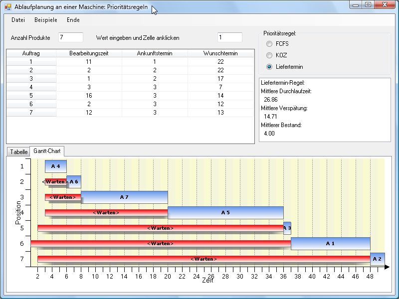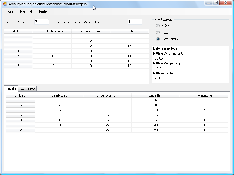 Es werden drei Prioritätsregelverfahren zur Maschinenbelegungsplanung