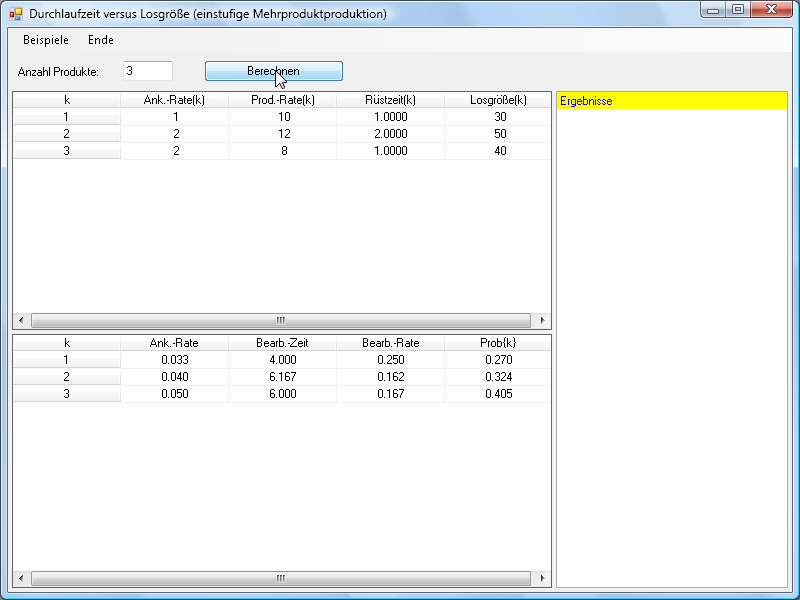 Der Zusammenhang zwischen der Losgröße und der Durchlaufzeit von Aufträgen an einer Maschine wird unter stochastischen Bedingungen mit Hilfe eines Warteschlangenmodells beschrieben. Die Eingabedaten für die Berechnung der Kenngrößen des Warteschlangensystems werden aus den produktbezogenen Daten (Produktionsraten, Nachfrageraten, Rüstzeiten usw. ) abgeleitet.