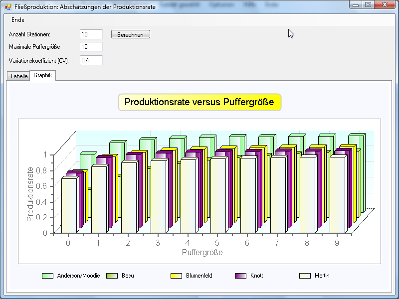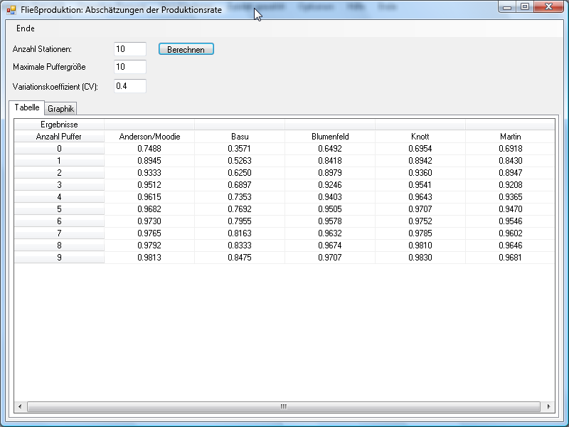 mit begrenzten Puffern und stochastischen Bearbeitungszeiten numerisch ausgewertet.