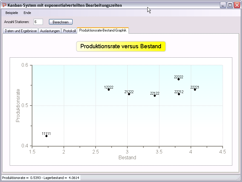 Für jede analysierte Kartenverteilung wird ein Punkt in einem Diagramm angezeigt, daß die Beziehung zwischen Lagerbestand und Produktionsrate wiedergibt. In diesem Diagramm kann man durch gleichzeitiges Betätigen der Ctrl-Taste und Bewegen der Maus die Graphik vergrößern bzw. verkleinern. Mit der Shift-Taste und Bewegen der Maus kann die Ansicht innerhalb des Koordinatensystems verschoben werden.