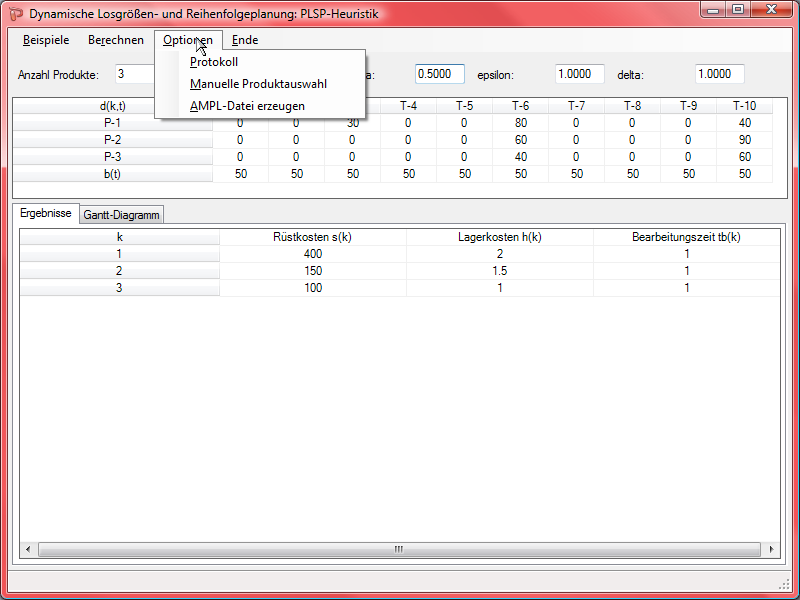 In den Optionen kann festgelegt werden, ob der Verfahrensablauf detailliert protokolliert werden soll oder ob nur die Ergebnisse ausgegeben werden sollen. Darüberhinaus zu Testzwecken durch die Option der manuellen Produktauswahl in den Verfahrensablauf eingegriffen werden. Schließlich kann ein AMPL-Modell für die gegebenen Daten erzeugt werden.