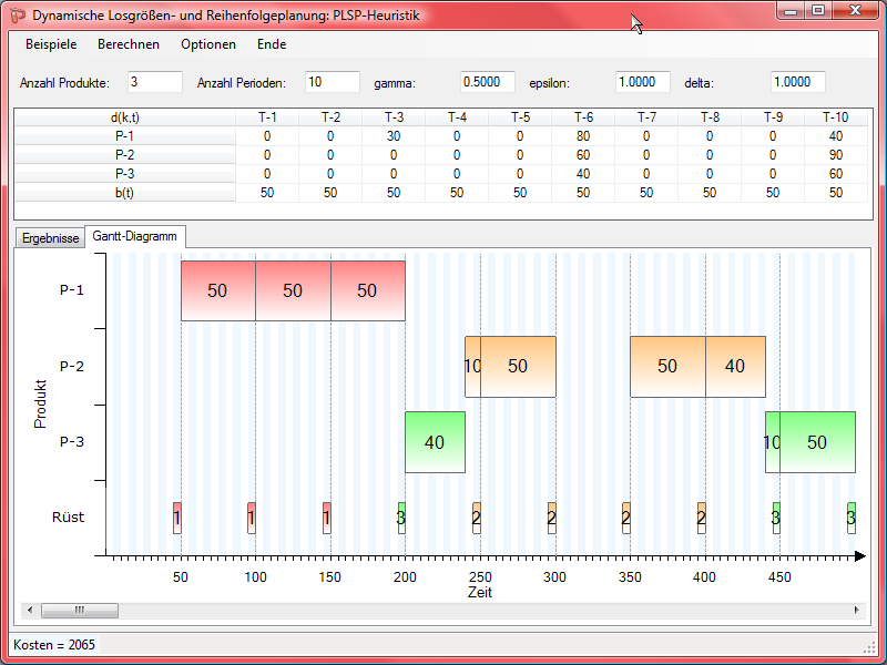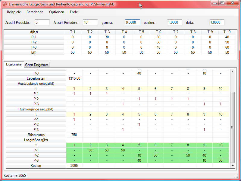 Durch mehrmaliges Betätigen des Berechnen-Menüpunkts können unterschiedliche Produktionspläne mit unterschiedlichen Zufallszahlen erzeugt werden.