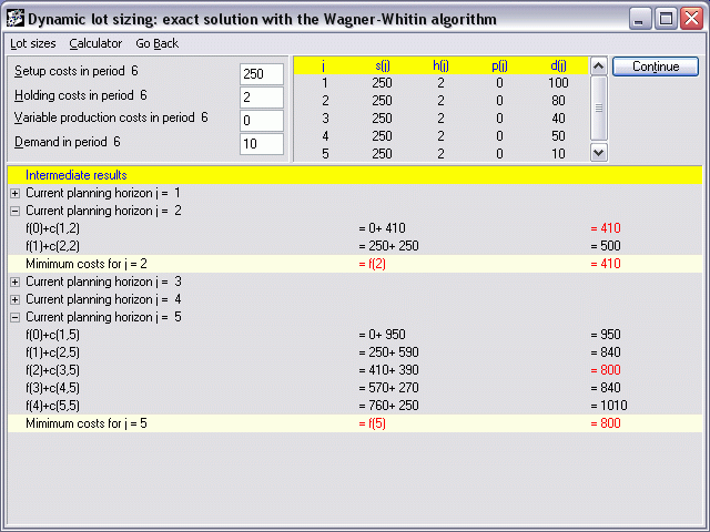 Dynamic lot sizing: exact solution of the Wagner-Whitin
