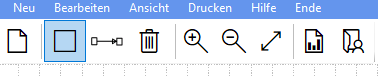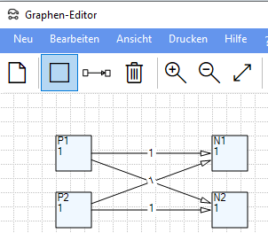 Ein Knoten kann gelöscht werden, indem man zunächst den Knoten durch Anklicken auswählt und dann den Papierkorb-Button drückt. Vorher muß der Modus "Knoten einfügen" bzw. "Pfeil einfügen" deaktiviert werden (Keine blaue Markierung mehr).