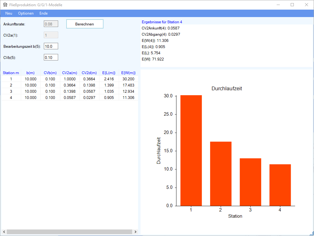 In diesem Modul werden die einzelnen Stationen eines asynchronen (elastisch verketteten) Fließproduktionssystems als $GI/G/1$-Warteschlangensysteme modelliert. Die Leistungskenngrößen (mittlere Durchlaufzeiten, Warteschlangenlängen) des Fließproduktionssystems werden - beginnend mit der ersten Station - nacheinander berechnet. Dabei wird die Tatsache ausgenutzt, das der Output einer Vorgängerstation zum Input der unmittelbaren Nachfolgerstation wird.