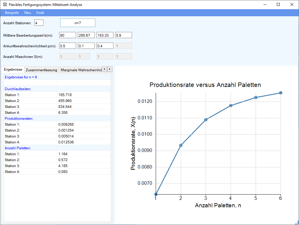 Ein flexibles Fertigungssystem wird in diesem Modul durch ein geschlossenes Warteschlangennetzwerk mit einem zentralen Server modelliert. Anders als im Modul Statische Analyse wird hier von einer begrenzten Anzahl zirkulierender Paletten ausgegangen. Die letzte Station stellt das Transportsystem dar, dessen Ankunftswahrscheinlichkeit auf 1.0 fixiert ist. Die Vorgehensweise zur Bestimmung der Daten aus gegebenen Arbeitsplänen der Produktarten ist detailliert in Tempelmeier/Kuhn (1993) beschrieben.