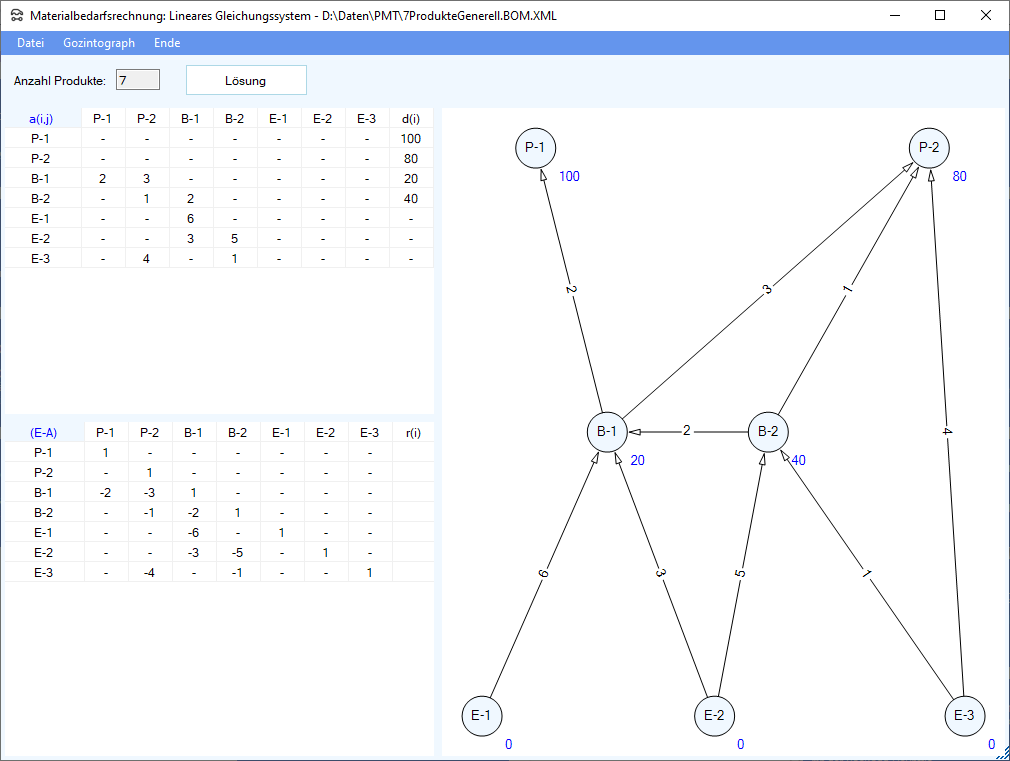Der Gozintograph wird mit Hilfe des Graphen-Editors definiert. Die Direktbedarfskoeffizienten und die Primärbedarfe können in der oberen Tabelle eingegeben werden.