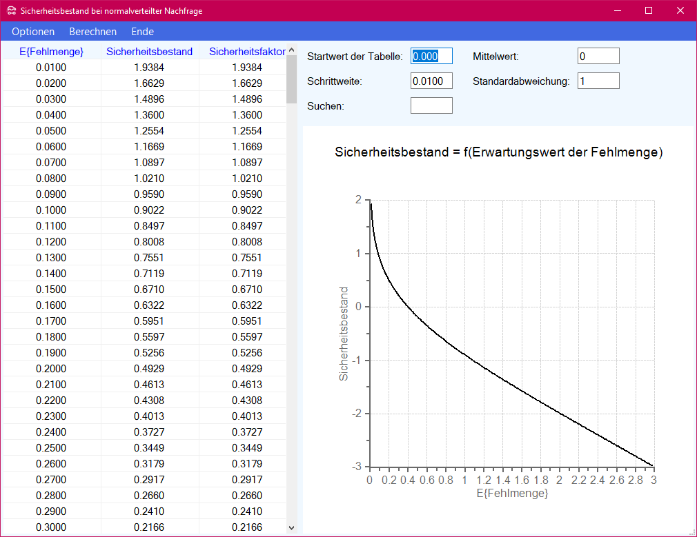 In diesem Modul werden in tabellarischer Form der Zusammenhang zwischen den Größen Sicherheitsfaktor $v$, Fehlmengenwahrscheinlichkeit und Fehlmengenerwartungswert dargestellt. Man kann den Mittelwert und die Standardabweichung eingeben. Für den Mittelwert $\mu=0$ und die Standardabweichung $\sigma=1$ werden die Ergebnisse der Standardnormalverteilung berechnet und graphisch angezeigt. Dieses Modul ersetzt die in vielen Lehrbüchern angegebenen Tabellen. Für die unabhängige Variable (X-Achse) sind folgende Möglichkeiten implementiert: