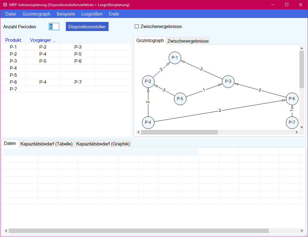 Nach dem Start werden zunächst die Dispositionsstufennummern der einzelnen Produkte berechnet. Im Anschluß daran werden verschiedene Tabellen angezeigt, in denen die weiteren Daten, die im Rahmen des Dispositionsstufenverfahrens berücksichtigt werden, eingegeben werden können.