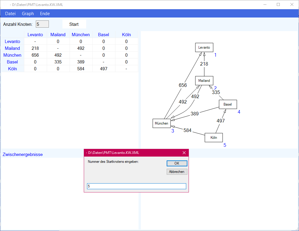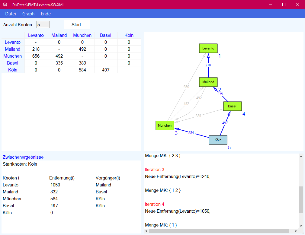 Vor der Durchführung der Berechnungen wird der Startknoten über ein Dialogfenster abgefragt. Dabei wird die Knotennummer angegeben, die rechts neben jedem Knoten angezeigt wird. Nach Abschluß der Berechnungen können die kürzesten Wege aus der Vorgängerliste abgelesen werden. Man startet mit dem Zielort (Levanto) und sucht dessen Vorgänger (Mailand) auf dem kürzesten Weg von Köln zum Zielort. Dann sucht man den Vorgänger (Basel) des Vorgängers (Mailand). Im Bild ergibt sich: Levanto <- Mailand <- Basel <- Köln.