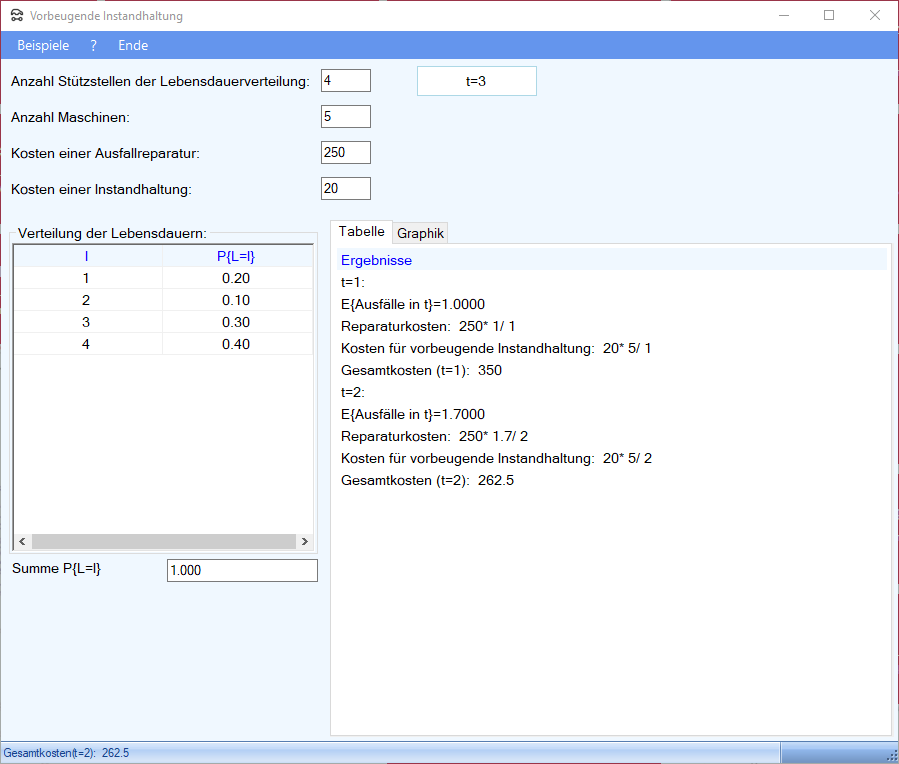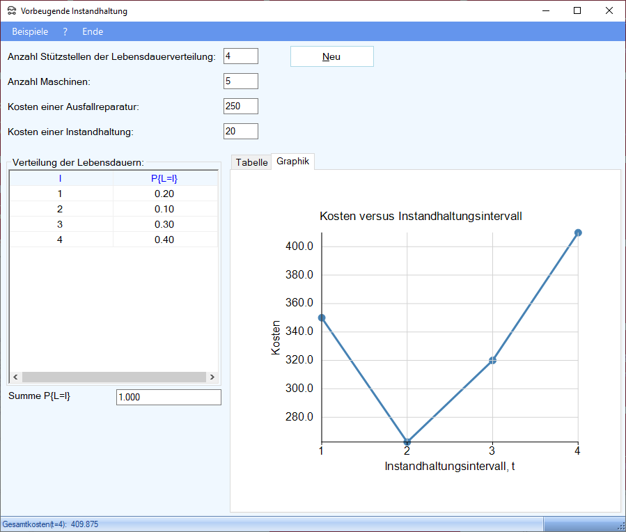 Es wird die Entscheidung über vorbeugende Instandhaltung versus Ausfallreparatur betrachtet. Für eine diskrete Wahrscheinlichkeitsverteilung der Lebensdauer eines Aggregates werden für unterschiedliche Instandhaltungsintervalle t die gesamten Kosten für Instandhaltungsmaßnahmen und Reparaturen berechnet.