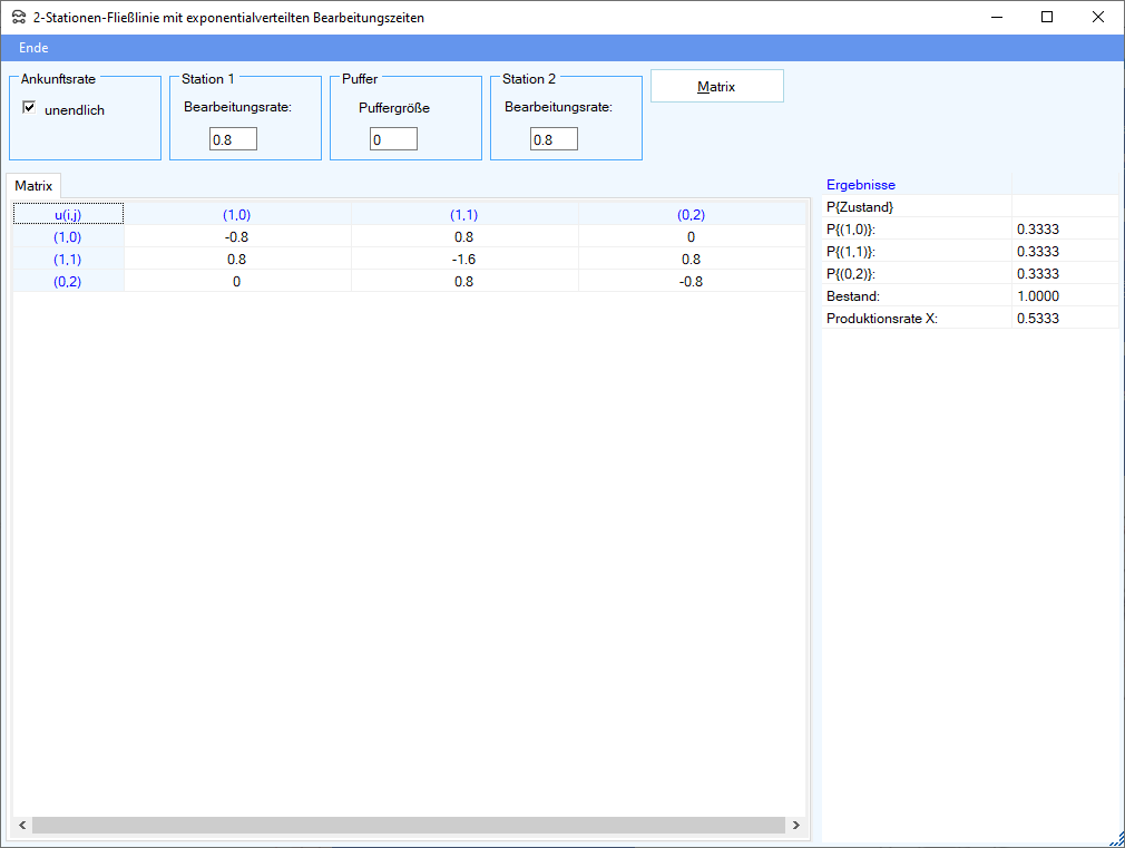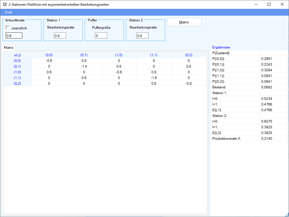 Station 2 ist niemals blockiert. Alle an Station 1 ankommenden Werkstücke, die keinen Zugang zu der Station finden (weil die Station arbeitet oder blockiert ist), werden abgewiesen. Daher kann die Ankunftsrate lambda größer als die kleinste Bearbeitungsrate das Minimum aus $\mu_1$ und $\mu_2$ sein.