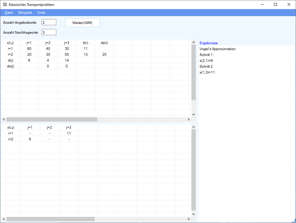 Zur Bestimmung einer Startlösung wird die Vogel'sche Approximationsmethode eingesetzt. Darauf aufbauend wird dann nach der MODI-Methode die optimale Lösung errechnet.