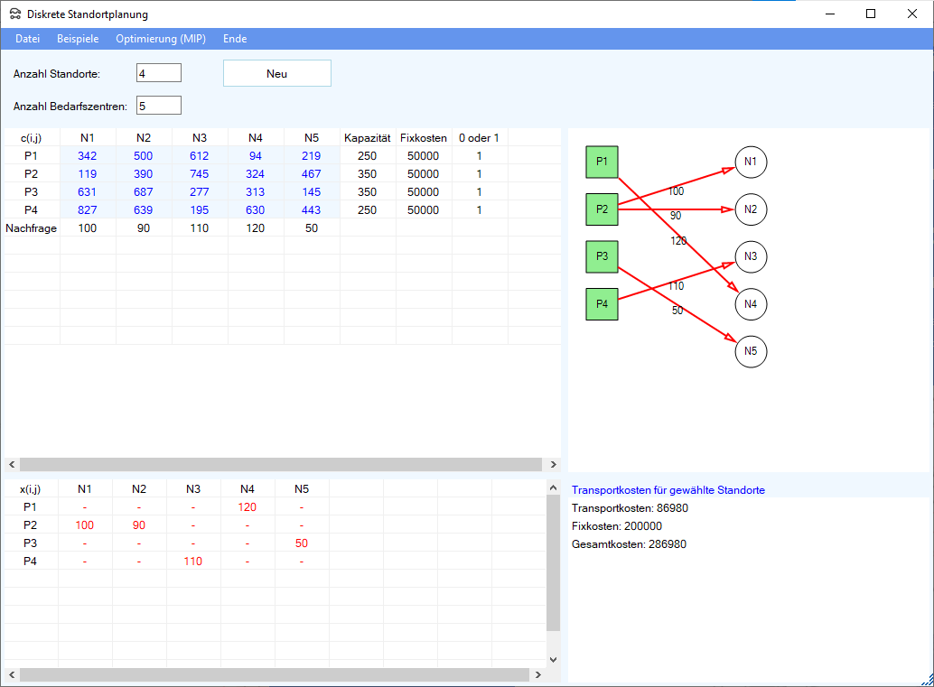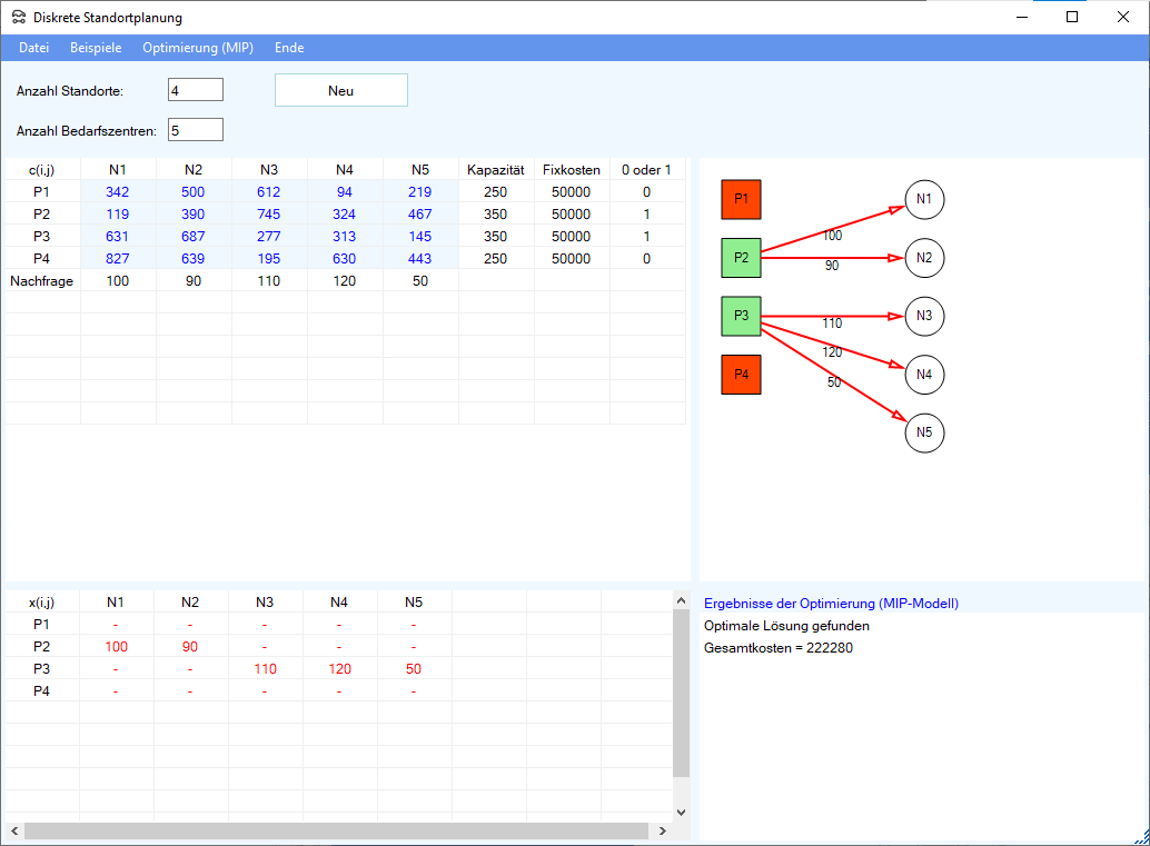 Wählt man den letzten Menüpunkt "Optimierung mit Python-MIP aus" aus, dann wird das mathematische Optimierungsmodell in einer für Python-MIP lesbaren Form erzeugt und gelöst. Die optimale Lösung wird dann wie üblich angezeigt.