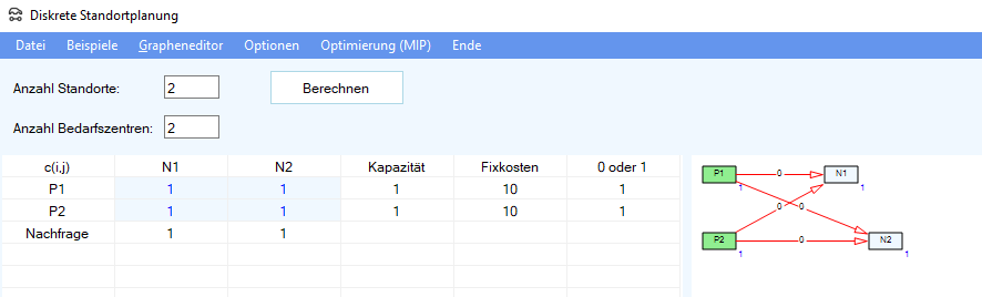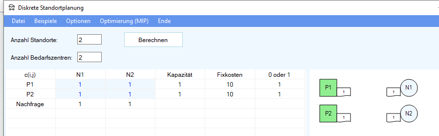 Durch Setzen eines Wertes 0 oder 1 in der Spalte "0 oder 1" (entspricht einer Binärvariablen im mathematischen Optimierungsmodell) kann der betreffende Standort geöffnet (1) oder geschlossen (0) werden. Für die so definierte Standortkombination wird dann durch den Button "Berechnen" das resultierende klassische Transportproblem zur Bestimmung der minimalen Transportkosten für die gegebene Standortkombination gelöst.