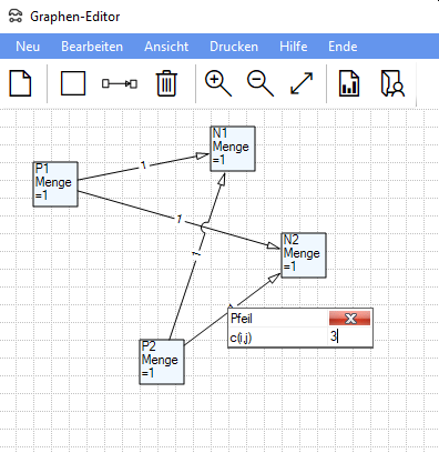 Knoten und Pfeile im Graphen können durch einen Rechtsklick mit der Maus editiert werden. Die geänderten Daten werden übernommen, wenn man und das "X" mit dem roten Hintergrund klickt.