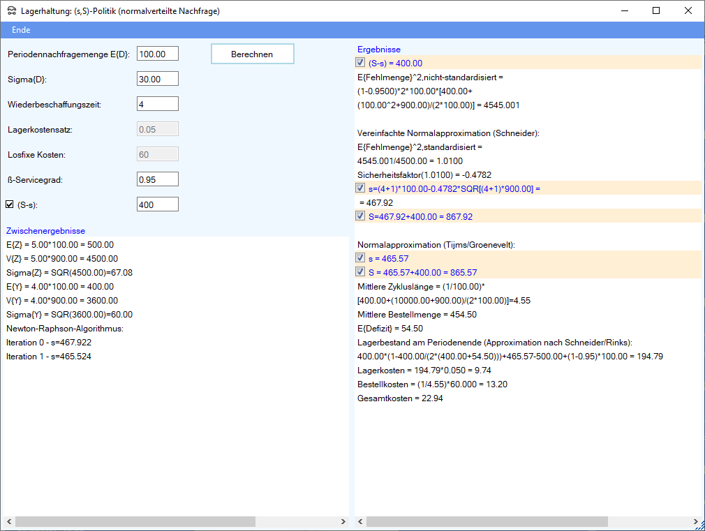 Die Differenz $(S-s)$ wird nach der klassischen Bestellmengenformel errechnet oder extern vorgegeben. Zur Bestimmung des Bestellpunkts $s$ wird die einfache Approximation nach Schneider und die Version nach Tijms/Groenevelt eingesetzt. Siehe hierzu Tempelmeier (2020c).