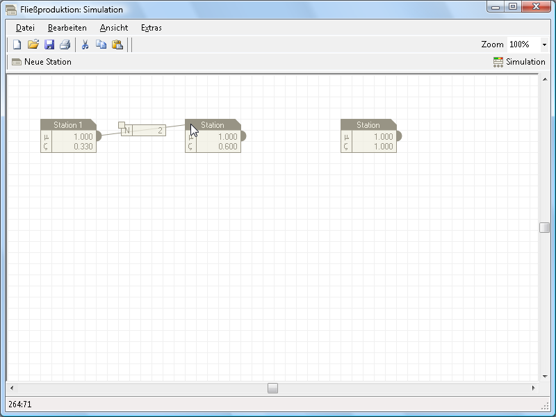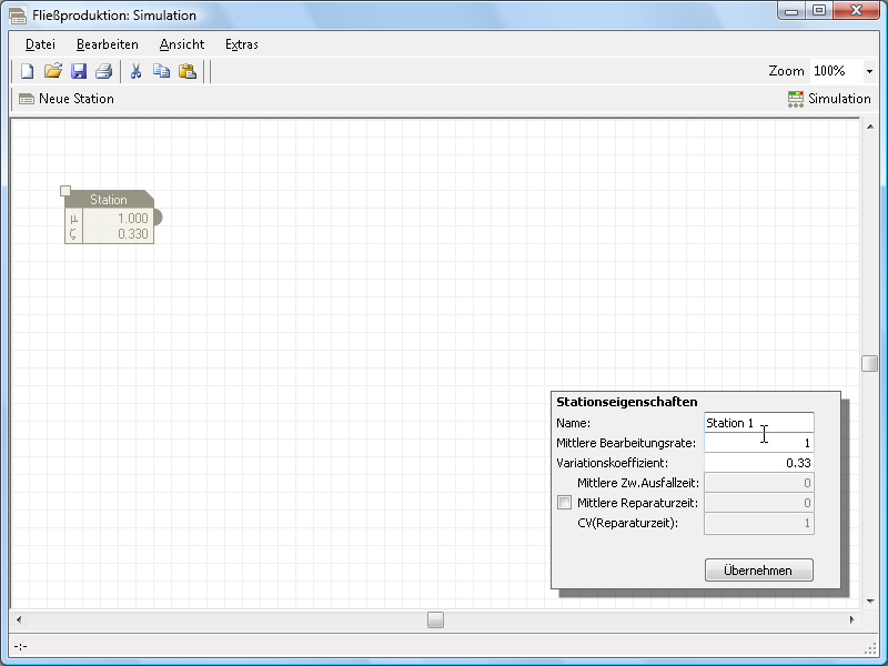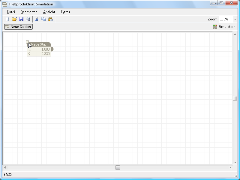Es wird ein asynchrones Fließproduktionssystem mit begrenzten Puffern und maximal fünf Stationen simuliert. Das Simulationsmodell wird mit einem graphischen Editor definiert. Die Bearbeitungszeiten an den Stationen werden als gamma-verteilt simuliert. An jeder Station können Störungen auftreten. Zunächst wird das Stationssymbol (oben links) angeklickt und auf die Arbeitsfläche gezogen.