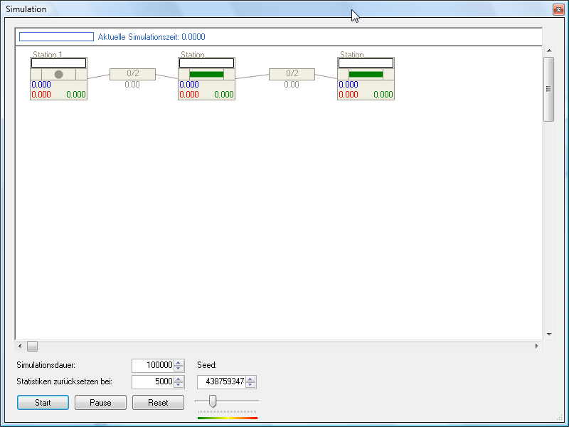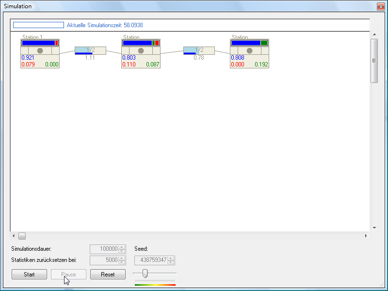 Während der Simulation wird in jedem Stationssymbol der aktuelle Zustand der Station angezeigt. Ein Kreis markiert ein Werkstück in Bearbeitung. Die Zahlen geben die durchschnittlichen Anteile der Zustände "arbeitet" (blau), "blockiert" (rot) und "leer" (grün) wieder. In den Kästchen für die Puffer gibt die rechte Zahl die Puffergröße und die linke Zahl die aktuelle Pufferbelegung an. Unter dem Kästchen wird der durchschnittliche Lagerbestand angezeigt.