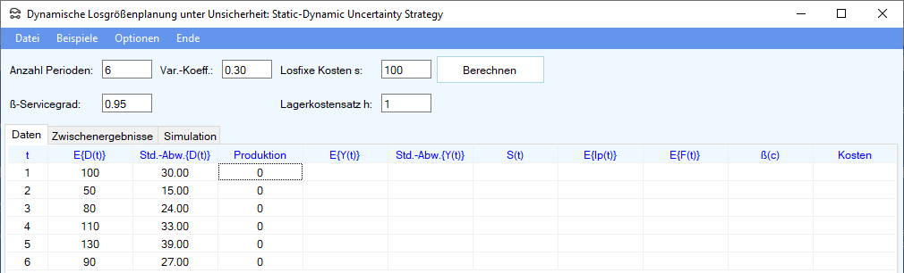 In diesem Modul wird die Static-Dynamic-Uncertainty Strategy zur Lösung des oben beschriebenen dynamischen Losgrößenproblems unter der besonderen Annahme betrachtet, daß die Periodennachfragemengen normalverteilt sind. In den einzelnen Perioden können die Erwartungswerte und die Standardabweichungen unterschiedlich hoch sein. Der Static-Dynamic-Uncertainty Strategy folgend werden die Produktionstermine und Ziel-Lagerbestände (Bestellniveaus) ex ante, also zu Beginn der Periode 1 festgelegt. Die konkreten Bestellmengen bzw. Produktionsmengen in einer Periode $t$ werden erst bestimmt, nachdem die Nachfragemengen der Verperioden $1,2,...,t-1$ beobachtet worden sind. Bezeichnen wird mit $q_t$ die Produktionsmenge in Periode $t$ und mit $ip_t$ den Lagerbestand am Anfang der Periode $t$, dann ist $q_t = S_t - ip_t$. Dabei wird vereinfachend angenommen, daß die Wiederbeschaffungszeit vernachlässigt werden kann. Die Lagerüberwachung findet nur an den ex ante festgelegten Terminen statt. Als Servicegrade können in diesem Modul gewählt werden: Beta(Zyklusbezogen), Alpha(Periodenbezogen), Alpha(Zyklusbezogen).