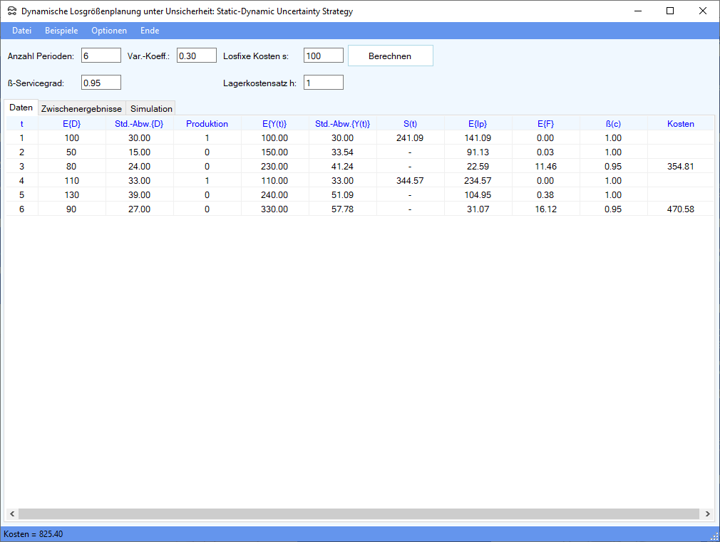Einige Erläuterungen zum Einstieg in die Thematik: Bei einer N(100,30)-verteilten Nachfragemenge in der Periode 1 und für den Fall, daß in Periode 1 nur der Nachfrage der Periode 1 produziert wird (d.h. Zykluslänge = 1), darf die Fehlmenge bei einem Servicegrad von 95% höchstens 5 betragen. Wegen der Normalverteilungsannahme bedeutet dies, daß die standardisierte Fehlmenge 0.1667 beträgt. Im Modul Sicherheitsbestand in der Modulgruppe Bestandsmanagement kann man den Wert des Sicherheitsfaktors finden, mit dem diese standardisierte Fehlmenge erreicht wird: 0.6073. Daraus folgt für das Bestellniveau in Periode 1 bei einer Zykluslänge von 1: $S_{11}=100+0.6073\cdot 30 = 118.22$.