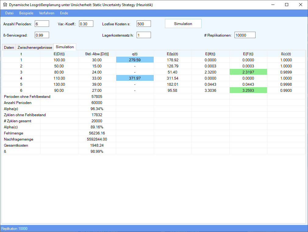 Zur Lösung des betrachteten Problems wird eine stochastische Version des heuristischen Silver-Meal-Verfahrens, das ursprünglich für deterministische Nachfrage entwickelt wurde, eingesetzt. Die Ergebnisse können mit Hilfe einer Simulation überprüft werden.