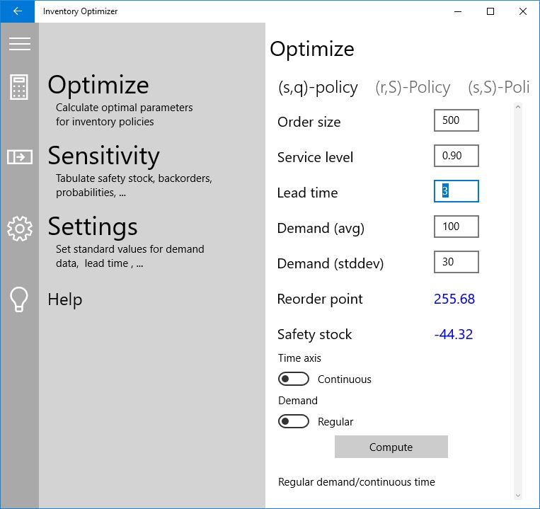 - Compute the optimum safety stock in an (s,q) inventory policy (reorder point - reorder quantity policy) (with continuous as well as discrete time axis).