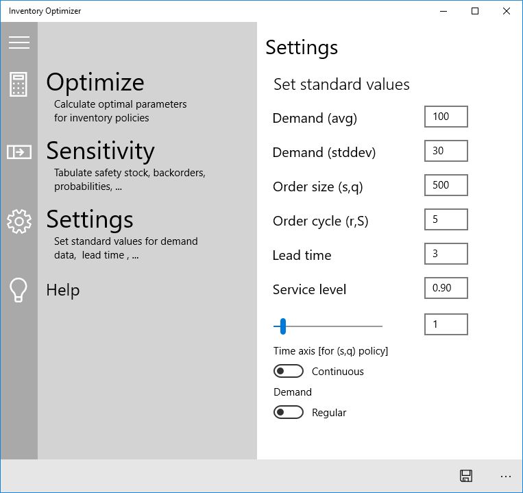 Inventory Optimizer helps in the optimization of several standard inventory policies used in practice. In particular, the following functions are available: