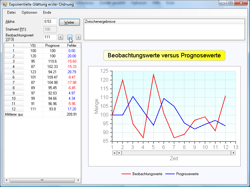 Nach Eingabe aller Werte kann der Einfluß des Glättungsparameters auf die Prognosequalität im Rahmen einer Sensitivitätsanalyse untersucht werden, die über die Optionen aktiviert wird. Es erscheint dann ein Schieberegler zur Veränderung von Alpha. Nach Veränderung von Alpha erhält man dann z.B. folgendes Bild: