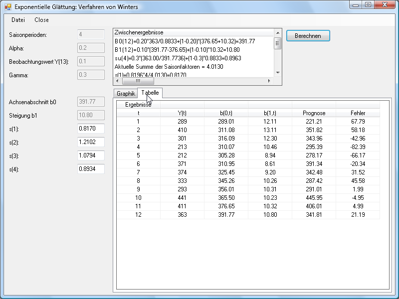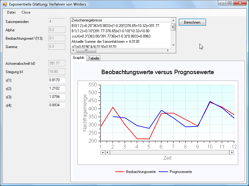 Es wird eine Prognose mit dem Verfahren von Winters für trendförmigen und saisonalen Bedarfsverlauf durchgeführt.