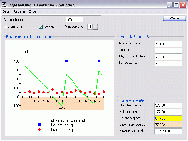 Es wird eine beliebige Lagerpolitik auf der Basis einer gegebenen (deterministischen) Zeitreihe aus Lagerabgangsmengen und Lagerzugangsmengen simuliert. Die Daten werden als zeitlich geordnete Wertepaare (Lagerabgang,Lagerzugang) aus einer Datei eingelesen. Ausgehend von einem vorgegebenen Anfangsbestand wird dann die Bestandsentwicklung graphisch dargestellt. Mit diesem Modul kann man sehr einfach die Kennzahlen einer Lagerpolitik bestimmen.