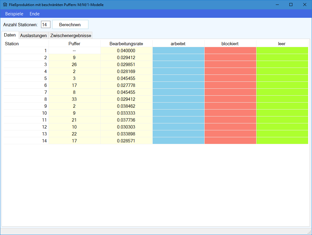 Bei unbeschränkten Puffern konnte die Produktionsrate des Fließproduktionssystems aus der Leistungsfähigkeit des Engpasses abgeleitet werden. Der Engpaß konnte einfach als Station mit der längsten mittleren Bearbeitungszeit identifiziert werden. Wenn Blockierungen an den Stationen auftreten können, dann heißt dies, daß die prinzipiell produktiv nutzbare Zeit einer Station nicht nur aus den Phasen "beschäftigt" (arbeitet) und "unbeschäftigt" (starved) besteht. Vielmehr kommt nun noch hinzu, daß die Station "blockiert" (blocked) sein kann. Bei Störungen kommt auch noch der Zustand "gestört" hinzu.