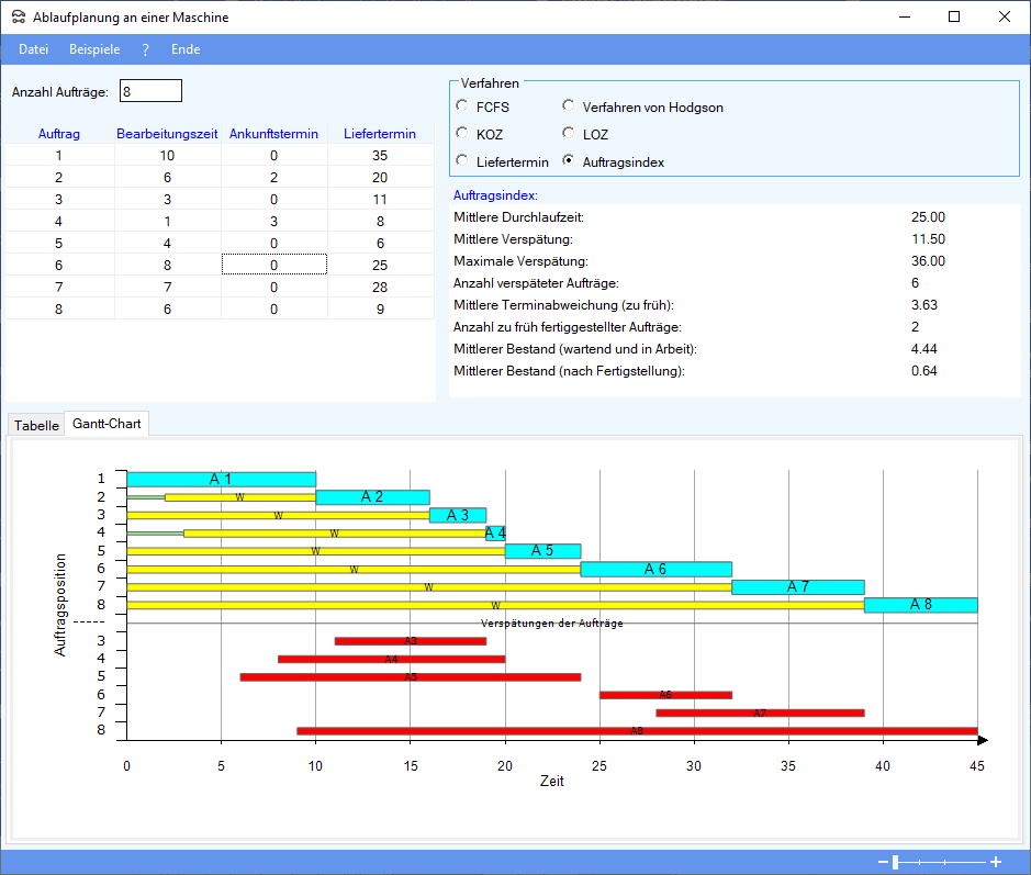 Es werden verschiedene Prioritätsregelverfahren zur Maschinenbelegungsplanung an einer Maschine hinsichtlich ihrer Auswirkungen auf verschiedene Zielgrößen verglichen: die FCFS-Regel, die KOZ-Regel und die Liefertermin-Regel. Darüberhinaus ist der Algorithmus von Hodgson (Moore) zur Minimierung der Anzahl verspäteter Aufträge implementiert. Man weiß, daß für den Fall, daß alle Aufträge zum Planungszeitpunkt an der Ressource zur Bearbeitung zur Verfügung stehen (statische Auftragsankunft, d.h. alle Ankunftstermine = 0), für die betrachteten Zielsetzungen unterschiedliche Einpplanungsregeln optimal sind. Siehe hierzu Günther/Tempelmeier (2020a).